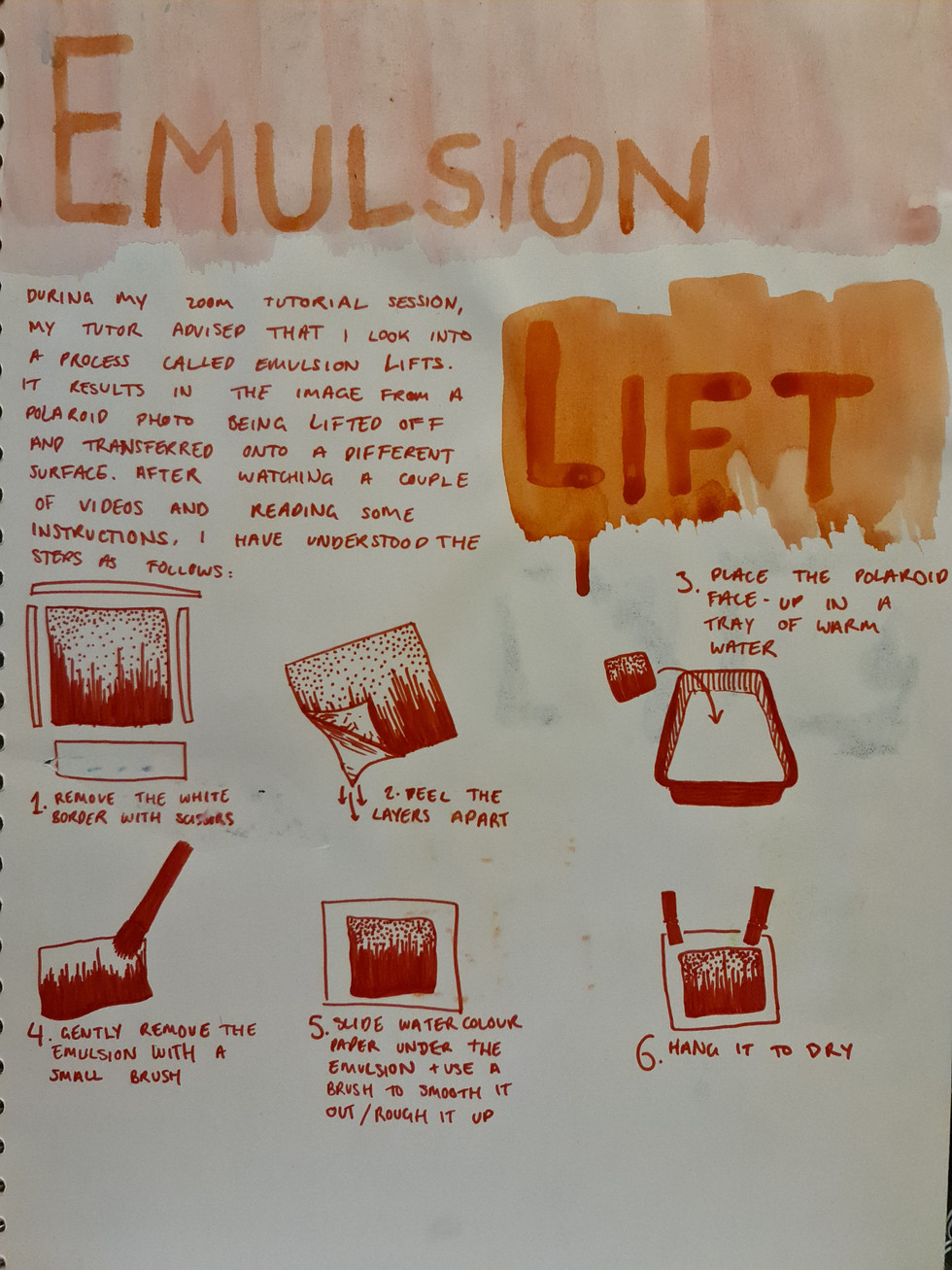 So as it turns out, Nicola Muirhead used a different type of film to the Colour 600 film I used, so bleaching the frames won't do the same thing as hers because there's a layer of plastic blocking the chemicals from the gelatine, which holds the actual image. Instead, Maddy suggested I try emulsion lifts. Here's the process as I wrote it when I first tried it last year: